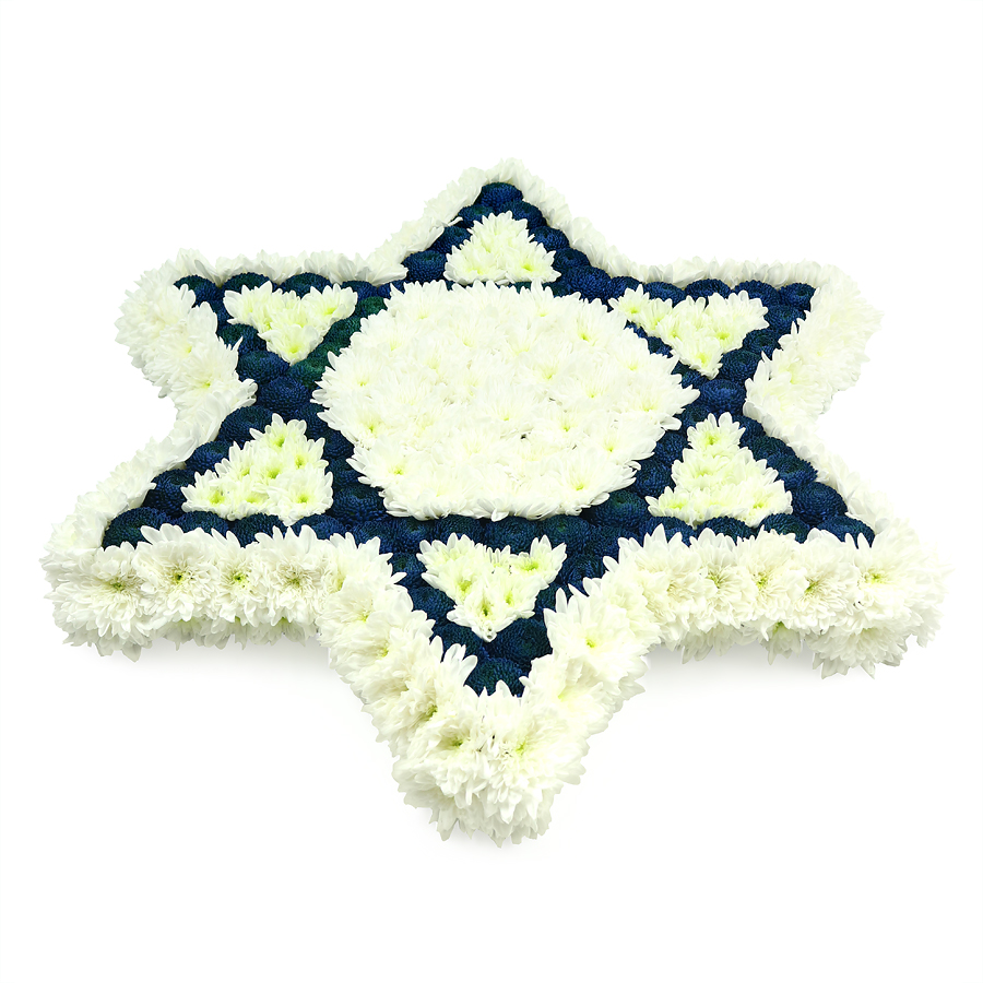 Honour the memory of your special person in the most gentle way with this Star of David flower arrangement that is made up of white and royal blue chrysanthemums. With this masterpiece, you can show all your love and offer your condolences to the family.